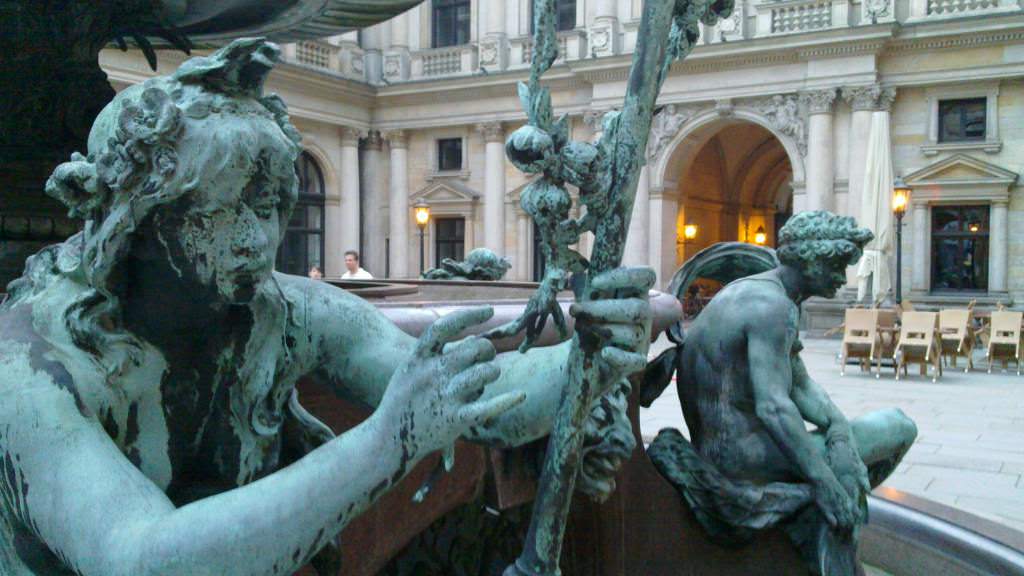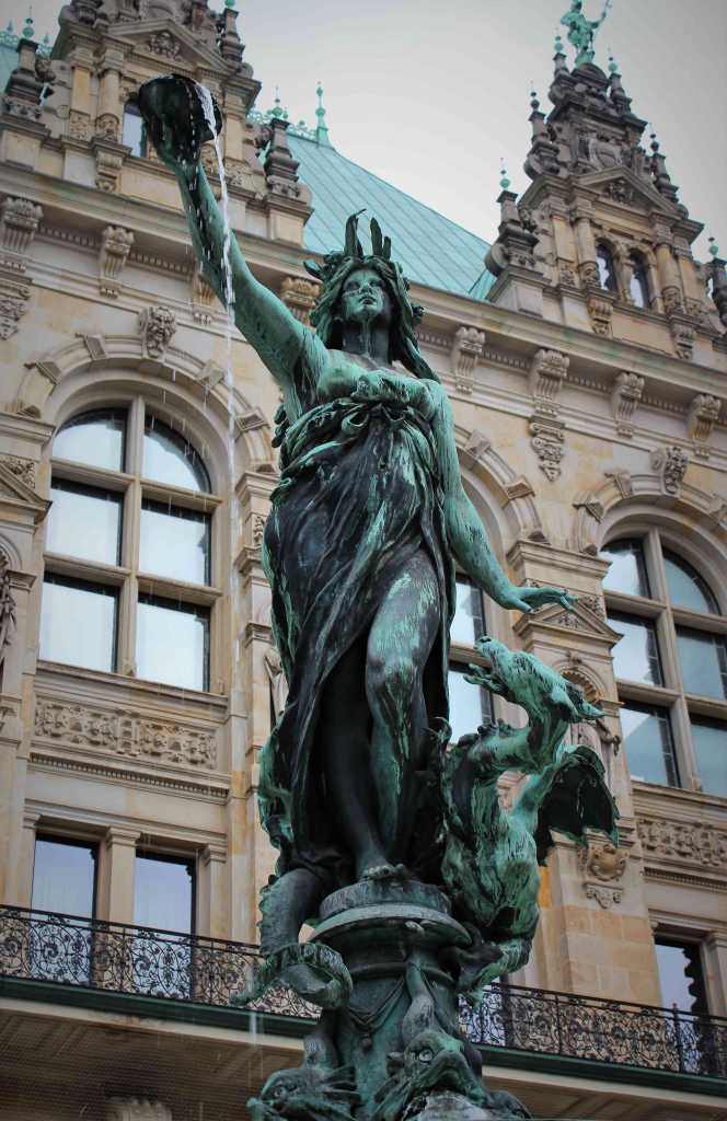 As figuras que se veem nas bordas da fonte simbolizam as diferentes conexões da cidade de Hamburgo com a água, por meio da representação de seres mitológicos, como o fauno que segura uma concha.